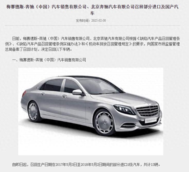 此外,同一日北京奔驰汽车有限公司也向国家市场监督管理总局备案了召回计划。自2025年2月14日起,召回生产日期在2024年10月23日至2024年11月22日期间的部分国产E级汽车,共计10795辆。